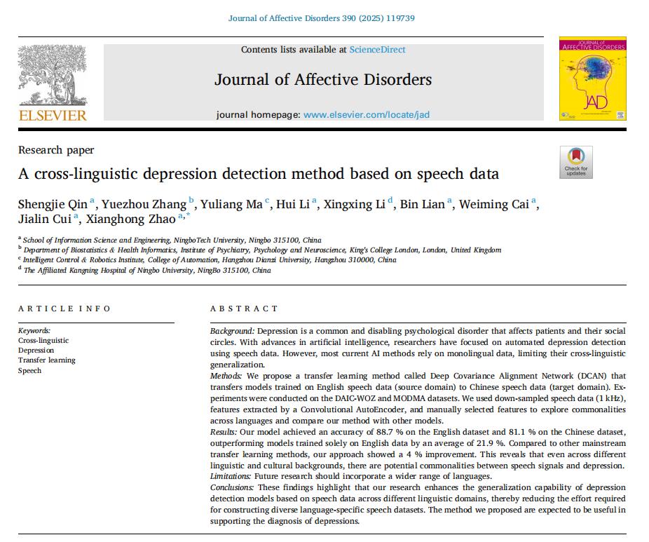 tyc8722太阳集团生命健康团队指导学院本科生的研究成果在国际权威期刊《Journal of Affective Disorders》发表