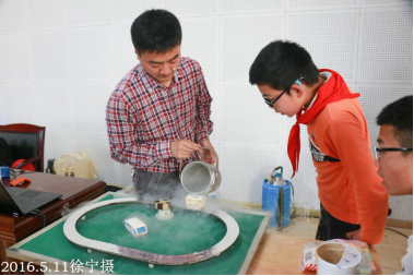 现场,蒋老师给同学们演示了体验低温和超导磁悬浮的实验。在体验低温环节,当蒋老师把准备好的干冰分发给同学们时,现场顿时沸腾了,“哇,好神奇,就像看《西游记》里悟空在腾云驾雾一样。”然而精彩的实验还在后面,软绵绵的棉花糖放进-196摄氏度的液氮中,就立刻变硬,轻轻一敲就碎了;前一秒还活蹦乱跳的小鱼放入液氮立刻冻得僵硬,重新放入水中又能复活如初;已经融化了的冰激凌倒入液氮,立刻又冻住了;放有超导材料的小车,经液氮冷却后,悬浮运行在磁性导轨上;将放有液氮的可乐瓶和1600只彩色乒乓球放在一个水桶中,一秒,两秒,砰……,可乐瓶炸开,空中,地面上,彩色的乒乓球瞬间被炸得到处都是。同学们的热情瞬间被这些好玩的科学实验点燃,纷纷发出了惊叹。