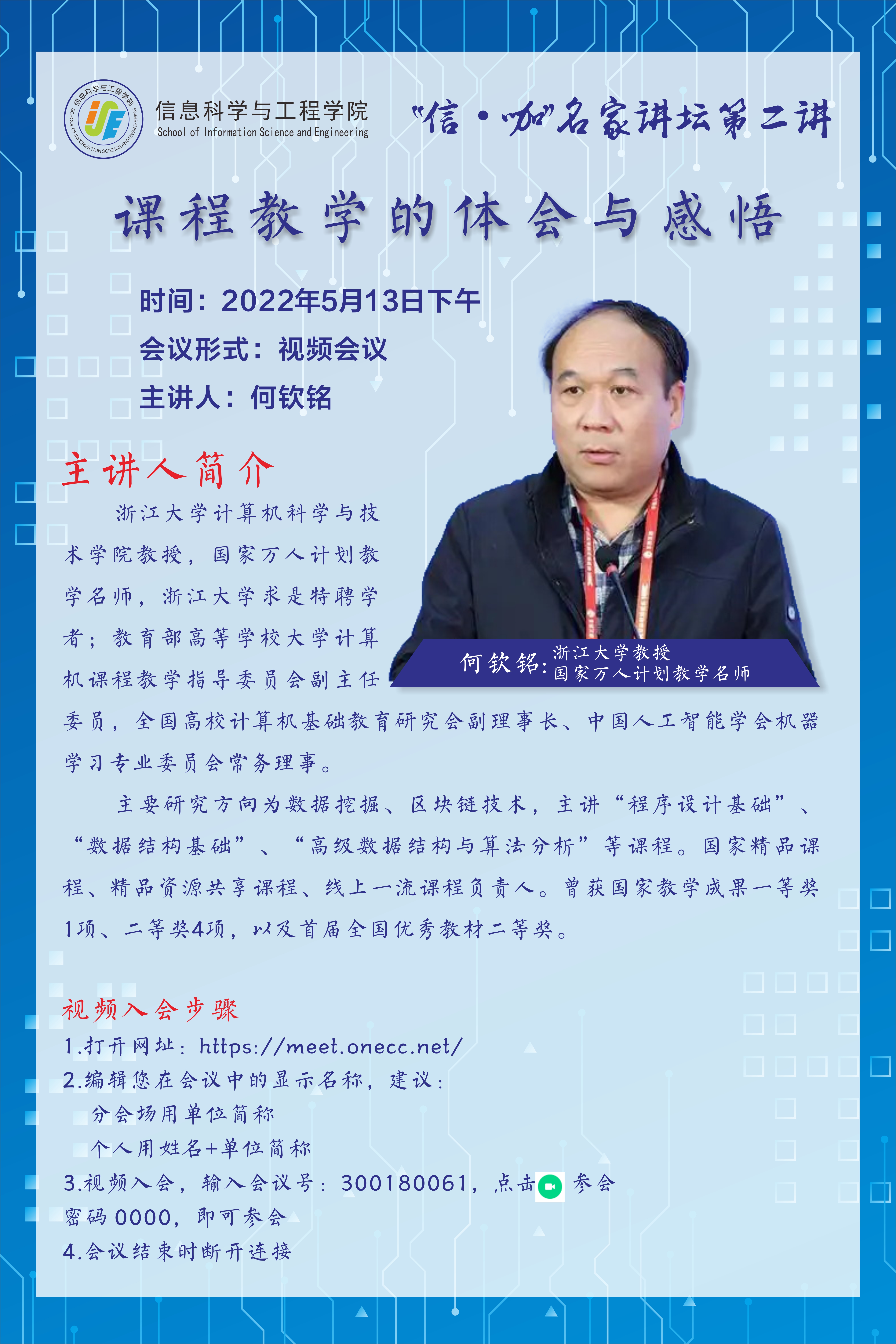 何钦铭浙江大学计算机科学与技术学院教授,国家教学名师,浙江大学求是特聘学者;教育部高等学校大学计算机课程教学指导委员会副主任委员,全国高校计算机基础教育研究会副理事长、中国人工智能学会机器学习专业委员会常务理事。
