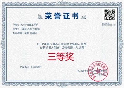 ⑤2022年8月2022第六届浙江省大学生机器人竞赛运输机器人对抗赛三等奖(省级)