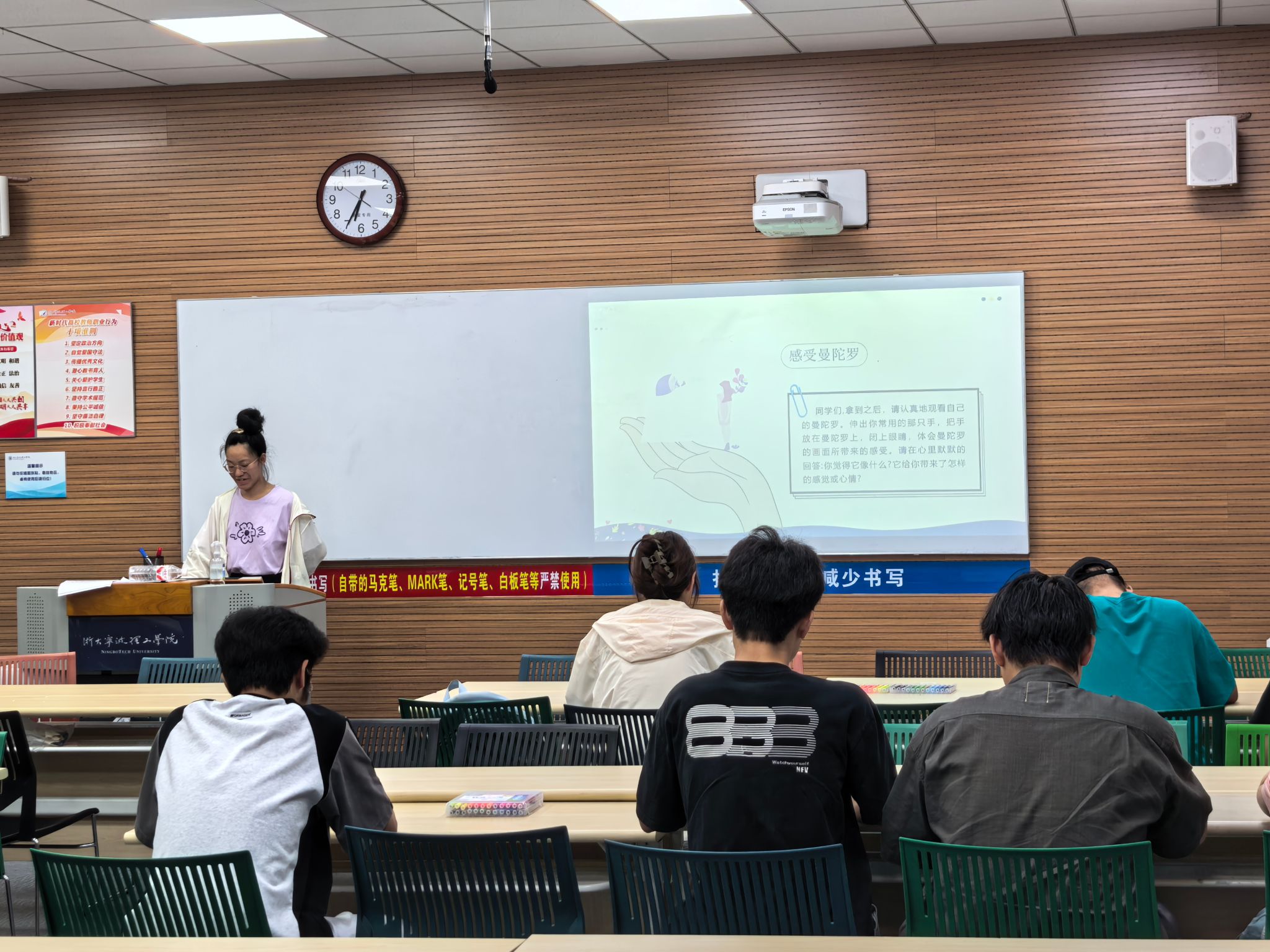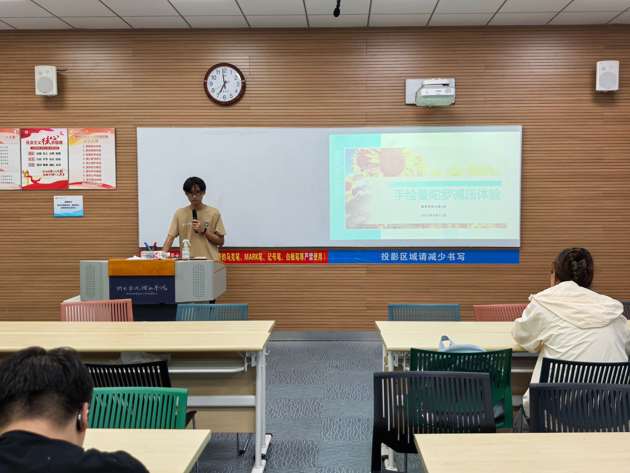 活动现场,同学们在主持人的引导下,同学们了解到曼陀罗绘画作为一种表达性艺术疗愈形式,其圆形的结构具有天然的凝聚与整合力量,能帮助同学们静心专注、释放内在情绪。