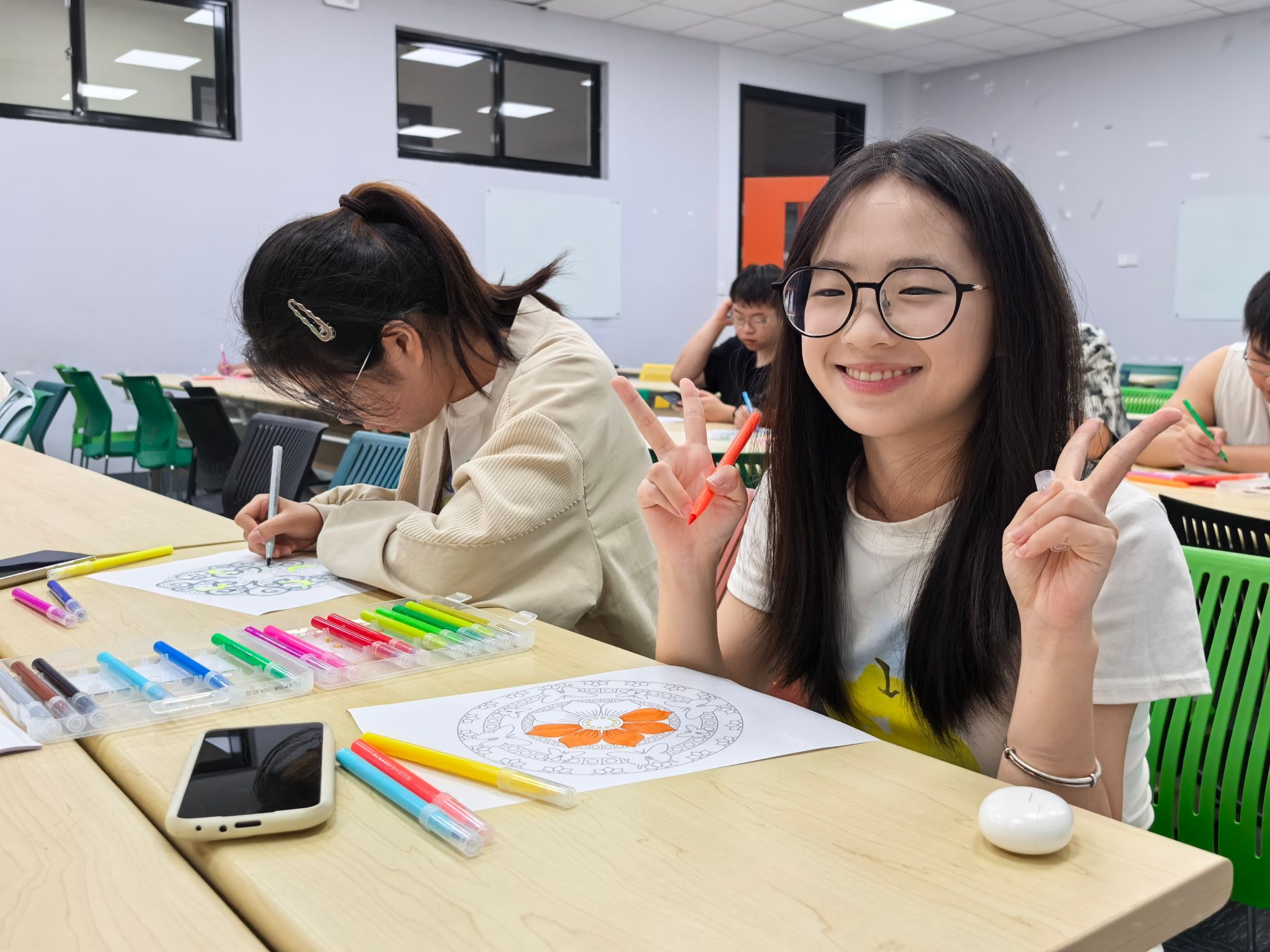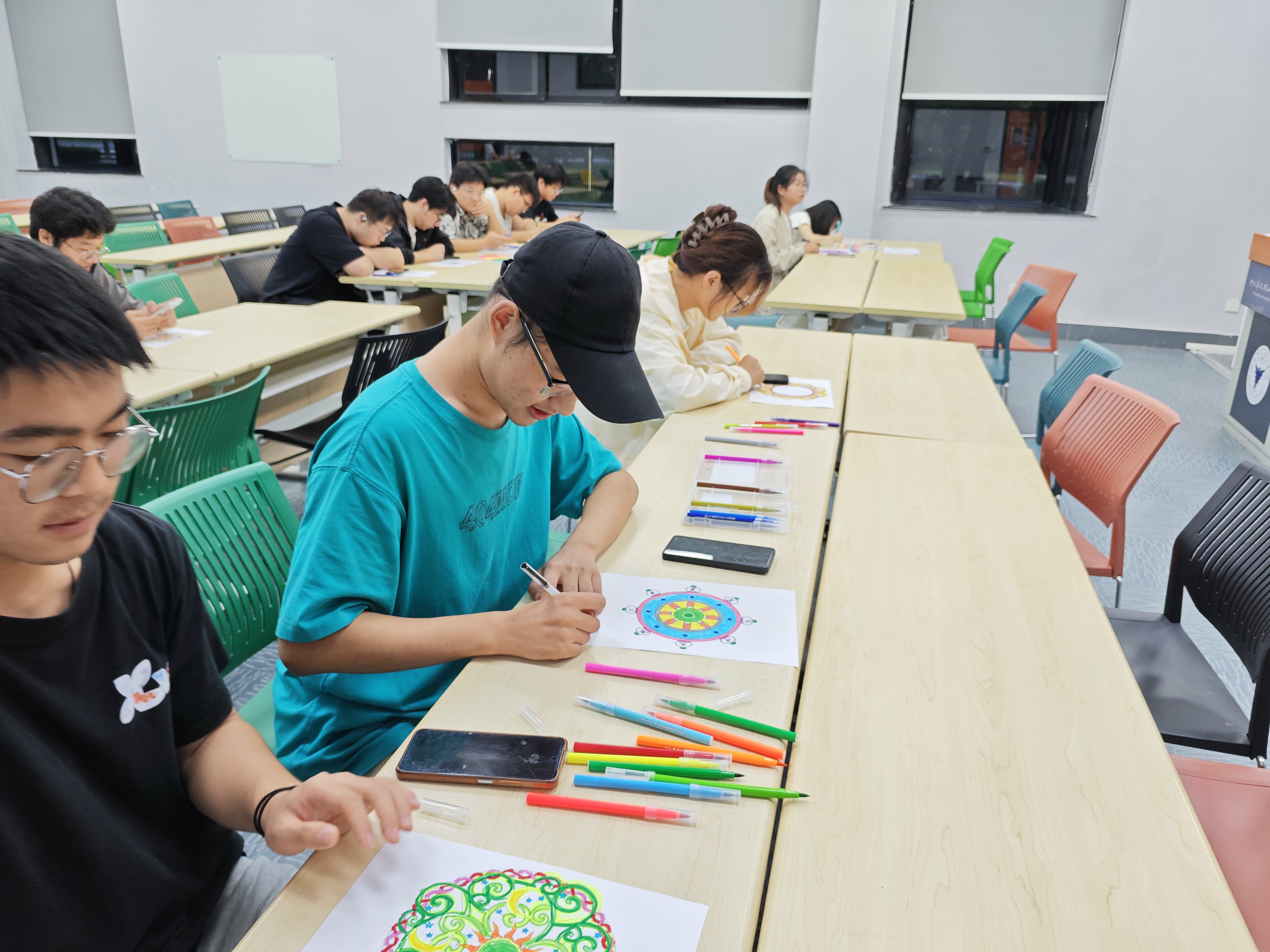 随着活动的展开,同学们纷纷沉浸在创作中。笔尖在纸上沙沙作响,明丽或沉静的色彩在圆形图案中逐渐铺展。有的同学下笔流畅,色彩对比鲜明,仿佛在宣泄积累的紧张;有的则细腻涂抹,层层叠加,在重复的动作中找到秩序与安定。现场氛围专注而放松,空气中弥漫着一种集体创造的宁静感。不少同学表示,当全神贯注于眼前图案与色彩的选择搭配时,那些关于考试和复习的纷繁思绪暂时被搁置,内心体验到一种久违的平静。
