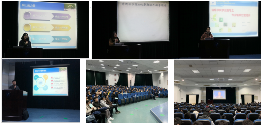 会议伊始,教务办副主管王媛媛老师向同学们解读了大一新生培养方案,以数据兼并文字的形式分析了各班第一学期学业表现以及各专业毕业的学分要求。随后,周维老师介绍了外语学院的美国、波兰、日本三个暑期游学团项目,从学习、科技、文化、校园生活等几个维度分享了自己在外游学时的切身体会。周老师的幽默风趣及富有具感染力的发言,引起了同学们极大的兴趣。接着,学工办三位老师依次就学院近期学风建设情况、安全稳定、升学、就业、团学、公益e青年、学科竞赛等相关工作作具体通报和部署,重点解读了大一新生评奖评优政策。