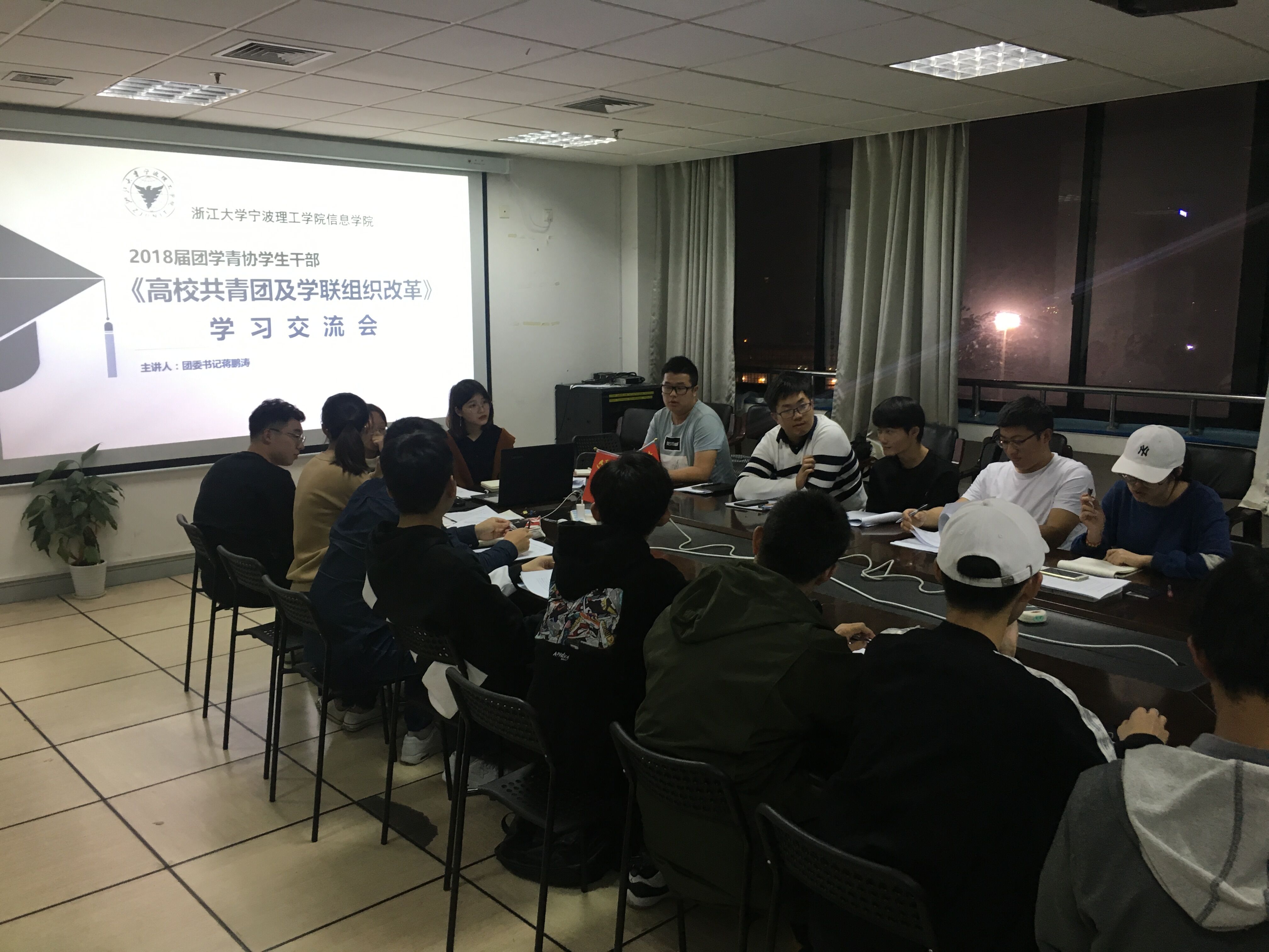 在交流会上,蒋鹏涛老师根据共青团改革实施方案对学院建设进行工作部署,明确改革方案实施的指导思想、基本原则、主要目标。希望团学能够构建项目化、扁平化、制度化的工作机制,提高团学的工作效率,促进“挑战杯”等项目的运行规范和内涵提升,打造“i成长”“i学习”“i文化”等tyc8722太阳集团团学品牌活动。同时提出要完善团学组织格局,落实部门责任制度,以团委为核心和枢纽,以学生会为学生自我服务、自我管理、自我教育、自我监督的主体,以学生社团及相关学生组织为外围延伸手臂。希望信息团学能够不断发展,不断进步。全体同学都认真聆听,受益匪浅。
