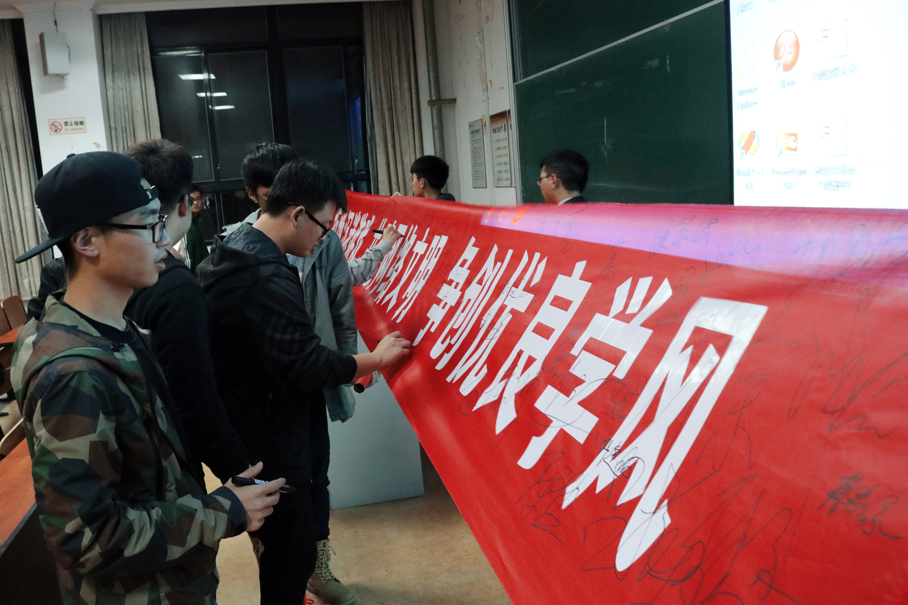 随后,傅晓宇老师通过平凡但意味深刻的身边例子,再次强调在大学之中学习的自觉性、考试诚信的重要性,同时表达对同学们参与考研,出国深造的期望。最后徐益亮老师通过对荒废学业,损害健康,违法犯罪等沉迷网络会带来的危害的讲解,告诫同学们应拒绝不良网络,回归健康生活,同时开展签名活动。三个年级的同学井然有序,在横幅上签下自己的名字。大会至此结束。