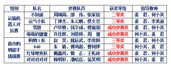 2017年5月12日-14日,浙江省第二届大学生机器人竞赛在浙江科技学院举行,来自浙江大学、杭州电子科技大学、浙江工业大学等省内30多所高校的329支队伍参赛。我院学生积极参与本项竞赛,共有56名学生报名,涵盖学院自动化、电气工程及其自动化、电信等专业学生,在裘君、何小其和李英道老师的指导下,经过长达5个月的集训和精心设计,在本次赛事中,共获得1项二等奖,3项三等奖和4项参赛奖,和第一届参赛成绩相比,有了稳步提高,具体获奖奖项见下表。