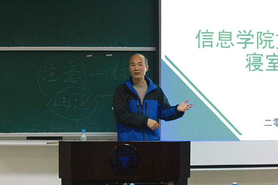 首先,叶卫树老师就校园安全做了讲解,生动有趣地将校园安全注意事项传递给在场每一个学生,从多年前“北大考察”到如今“19元8”的惨痛事实无不传达着维护校园安全的刻不容缓。随后,周春晓老师为我们讲解寝室安全注意事项,从私改电路与寝室吸烟等消防隐患到寝室卫生与室友关系,这些都是同学们实现文明寝室这个目标之前所需击垮的障碍。创建文明寝室旨在创建一个良好的生活学习环境,养成良好的生活习惯。之后,徐益亮老师指出浙江省高校公寓环境卫生标准,强调了寝室长职责,身为学生干部,寝室长应当担负起相应的责任。最后徐老师表达对在场寝室长们的期望:以身作责搞好寝室卫生;严于律己做好晚点名工作;团结友爱,营造良好寝室氛围。
