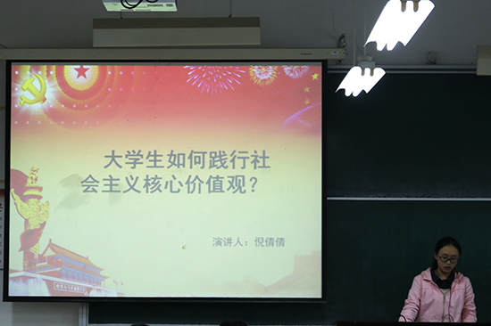 演讲比赛在党员干部徐鸿飞的主持下开始,13位入党积极分子分别对践行社会主义核心价值观及党政廉风建设方面阐述了各自的看法。大部分入党积极分子分别从国家、社会、家庭、个人这四个方面进行阐述,他们慷慨激昂的演讲也让在场人员对社会主义核心价值观的理解更加深刻。这13位入党积极分子一致提及到从实际行动践行社会主义核心价值观,并从个人的角度阐述了实践的作用。同时参赛者也强调了学习是第一位,没有好的成绩,何谈践行社会主义核心价值观。这次比赛的评分形式公正公开,在场的每个党员代表和入党积极分子都有一张评分表,当参赛者演讲完毕后,他们会对参赛者进行评分。最后在主持人徐鸿飞的总结下,本次演讲比赛顺利落下帷幕。