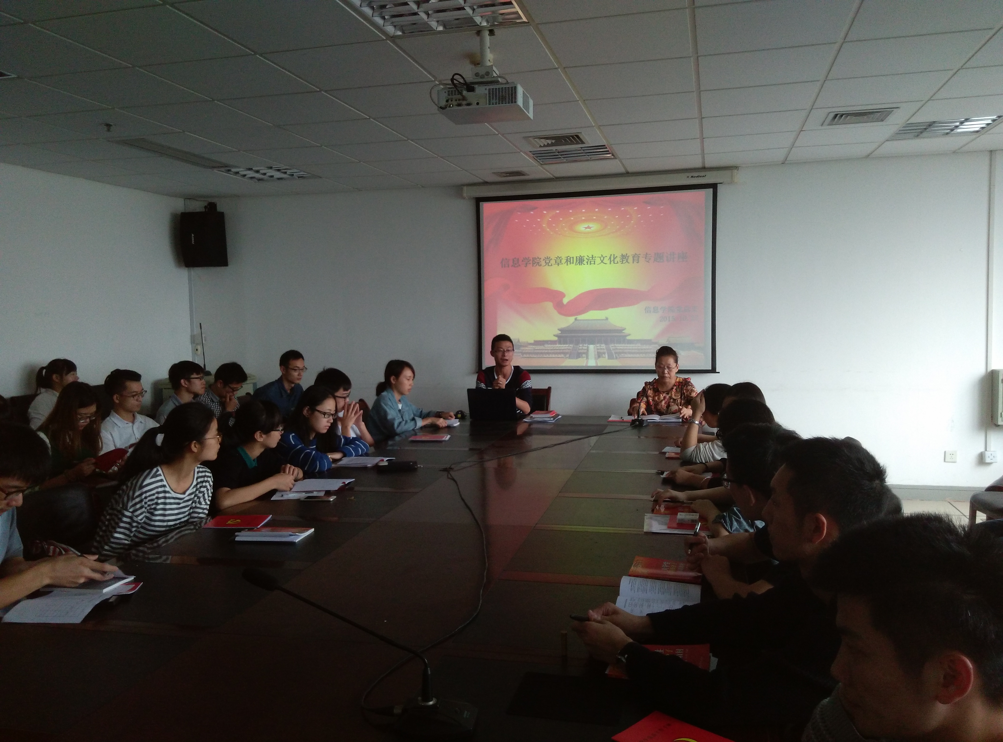在中国共产党发布《中国共产党廉洁自律准则》和《中国共产党纪律处分条例》之际,为了进一步加强党章、准则和条例的学习以及廉洁文化教育,tyc8722太阳集团于10月23日15:30在石麟大楼602会议室举行了党章学习和廉洁文化教育专题讲座。学院党建兼职组织员姜华老师、思政主管王常青老师、思政副主管邬旭东老师及党员和第二期发展对象培训班全体学员参加了此次专题讲座。本次讲座由思政副主管邬旭东老师主持。