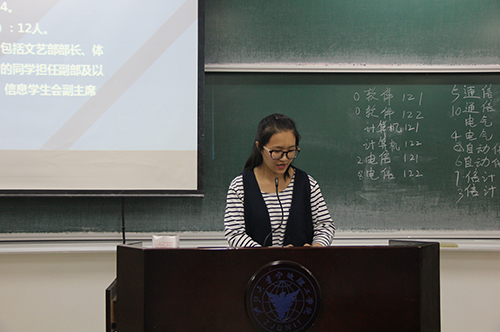 在14级的检查工作中,电气141班的班长首先上台,他通过PPT从各个方面向同学们展示了电气141班在学风建设上的具体举措。之后上台的班级代表也都用不同的方式对自己班级学风建设工作进行了详细的介绍。12、13级的各班班长也结合各自班级的实际情况,介绍了班级在创建优良学风班的过程中积累的经验,并反馈了遇到的相关问题,大家对如何杜绝现在依然存在的课堂不文明现象进行了探讨。