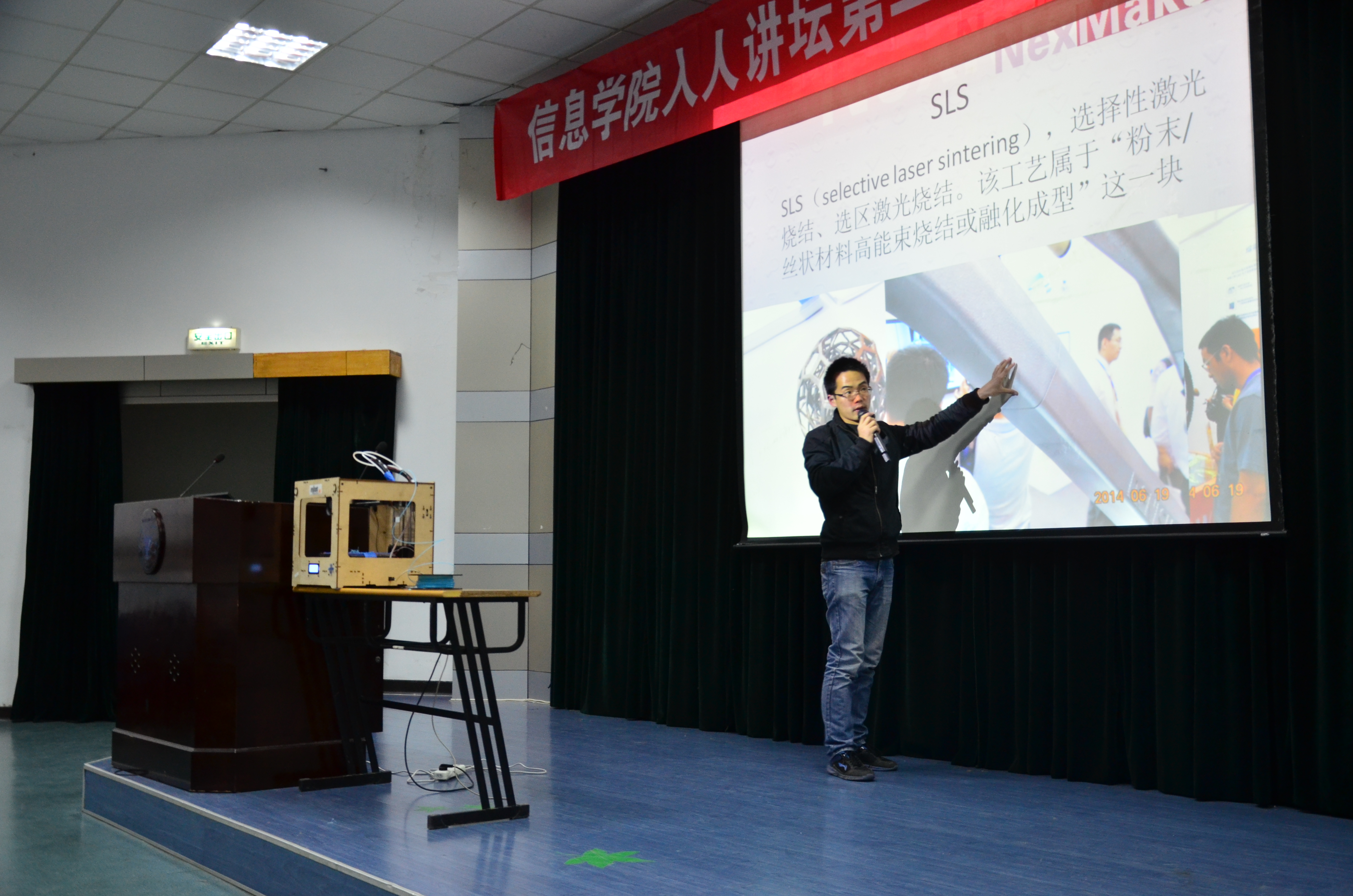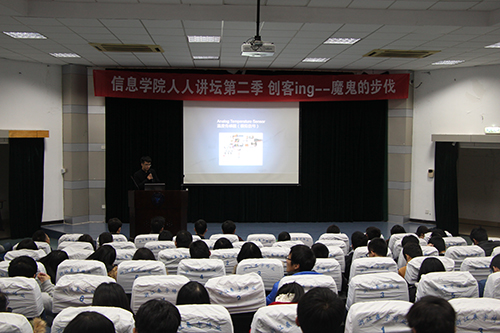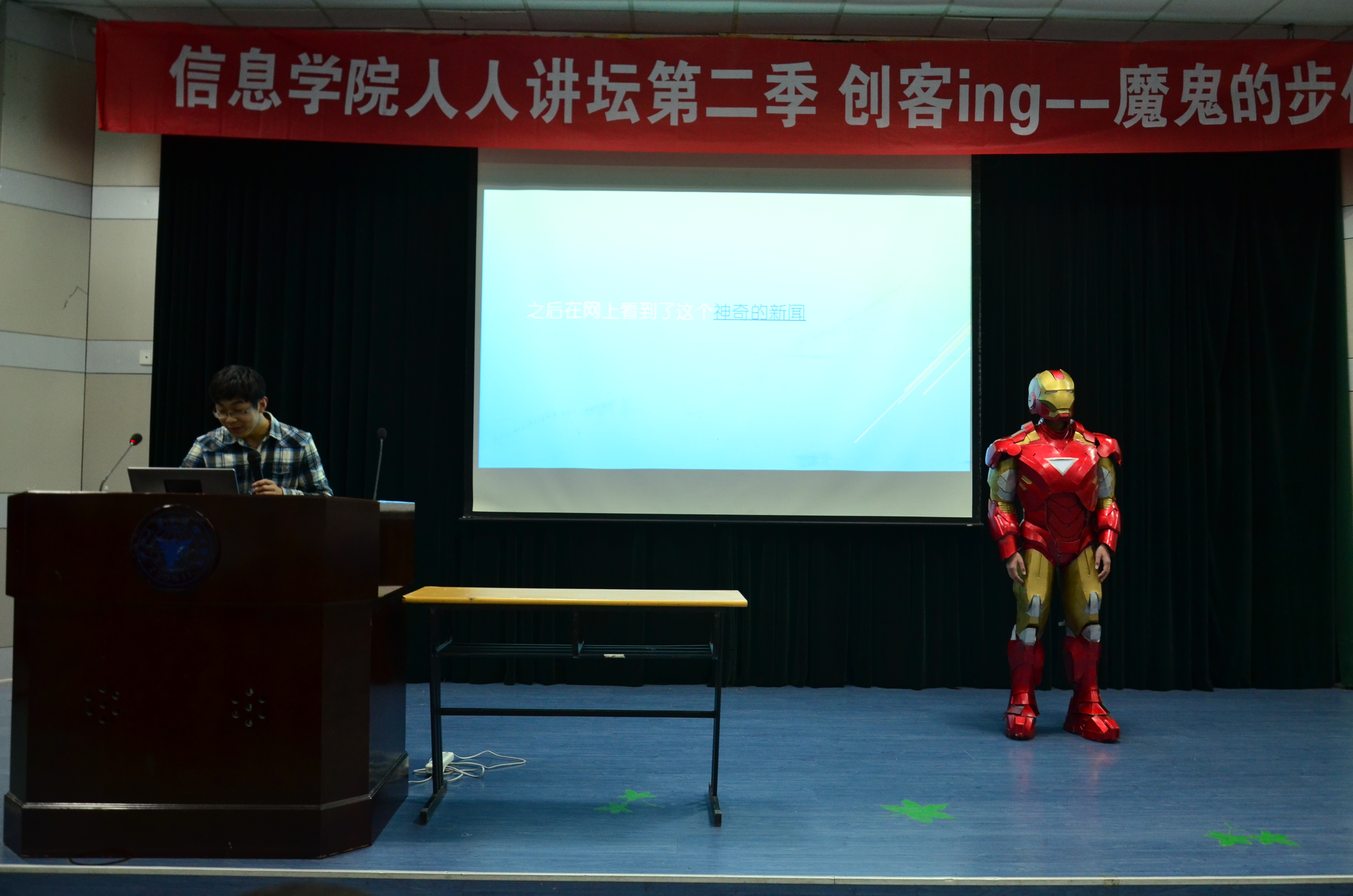 首先发言的嘉宾是NexMaker的总裁陈旺先生。陈旺先生以互联网的发展作为铺垫,介绍了NexMaker的发展,并且鼓励学生不要轻易放弃,在认真学习专业知识的同时也要着重培养自己的创新精神。第二位上场的是毕业后毅然走上“创客”之路的校友陈方毅,他介绍了一个高性能、高性价比的迷你PC平台“pcduino”的创作与原理。随后,“创客”吴波介绍了3D打印机的原理,向同学们讲述了3D打印机的未来发展方向,现场给同学们展示的3D打印成品引发同学们的啧啧称奇。第四位上场的嘉宾介绍了中科智慧家电以及阶梯科技。最后一位出场的是胡谢杰同学——宁波首个真人版钢铁侠的制作者。他幽默风趣地讲述了自己制作钢铁侠的过程,包括制作过程中面临的困难以及自己如何克服这些困难。