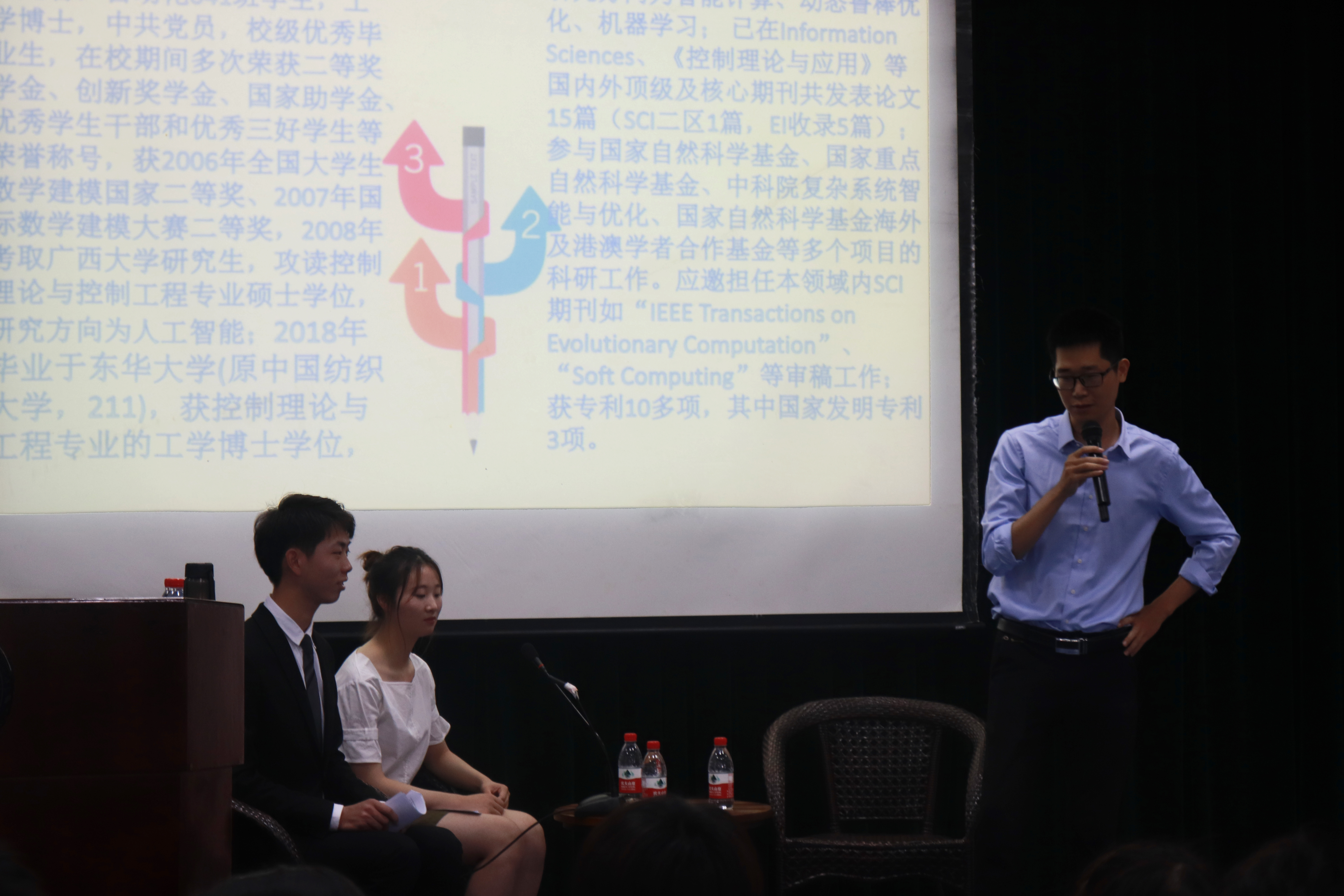黄元君学长作为最后一位上台发言的嘉宾,反复强调了大学生作为“知识分子”时学习的必要性。他提到,大学时期是树立正确思想的关键时期,而之后的所有奋斗都基于此时树立的目标之上。大学生在不同的时期需要去尝试不同的挑战,要找到适合自己发展的道路并为之奋斗终身。黄学长在校期间获2006年全国大学生数学建模国家二等奖、2007年国际数学建模大赛二等奖。黄学长2008年考取广西大学研究生,2018年毕业于东华大学博士研究生,在国内外顶级及核心期刊共发表论文15篇,参与多个项目的科研工作,曾获专利10多余项,其中国家发明专利3项。