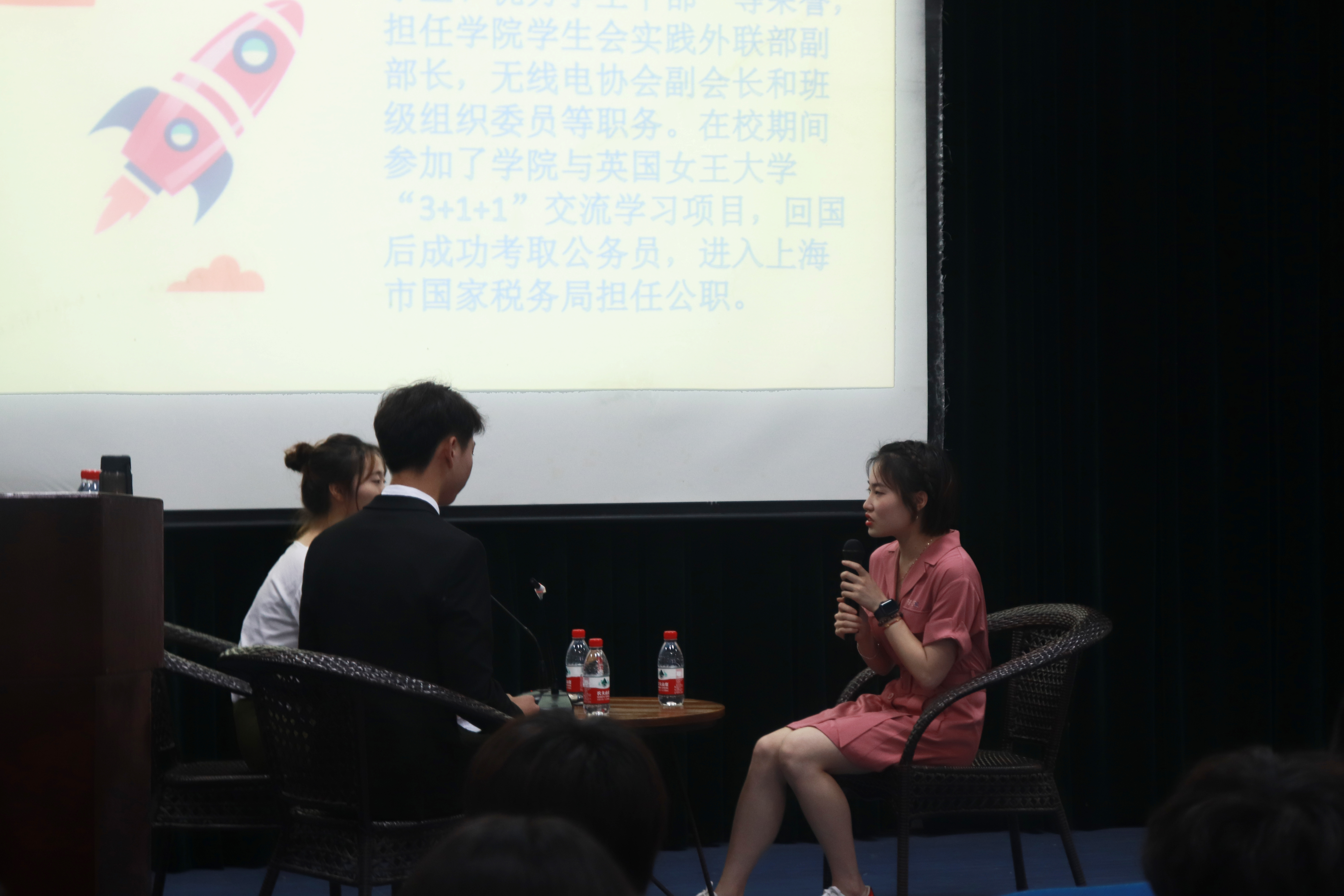 活动中,主持人分别与三位嘉宾展开了访谈对话。2016届校友邵莹莹学姐作为第一位上台的嘉宾,热情地向在场的同学分享了英国留学期间的所见所闻以及回国后考公的经历。邵莹莹在校期间曾获得一等、二等奖学金、“三好学生、优秀学生干部”等荣誉,参加了学院与英国女王大学“3+1+1”交流学习项目,回国后成功考取公务员,进入上海市国家税务局担任公职。