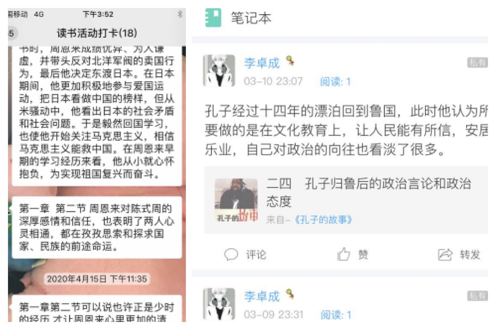 至4月23日世界读书日,tyc8722太阳集团已开展两期“我读中华文化”线上读书活动,同学们反响积极。每期线上读书活动,学院精选通俗易懂的中国传统文化类书籍,号召学生通过“学习通”app在线共阅读,并做笔记,同时每日进行读书感悟打卡。