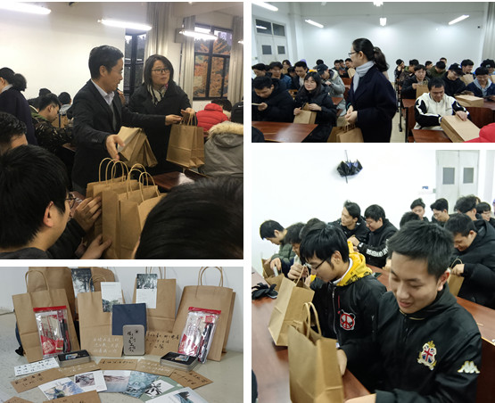 到场的老师们为在场的同学们送上了学院的暖心祝福:考研文具套装、学院定制版笔记本、定制版钥匙扣、正能量祝福卡片。一张张由职业发展部同学们精心设计撰写的卡片,满载着学弟学妹们的真挚祝福,同学们用热烈的掌声表达了对学院的感谢和一战到底的决心。