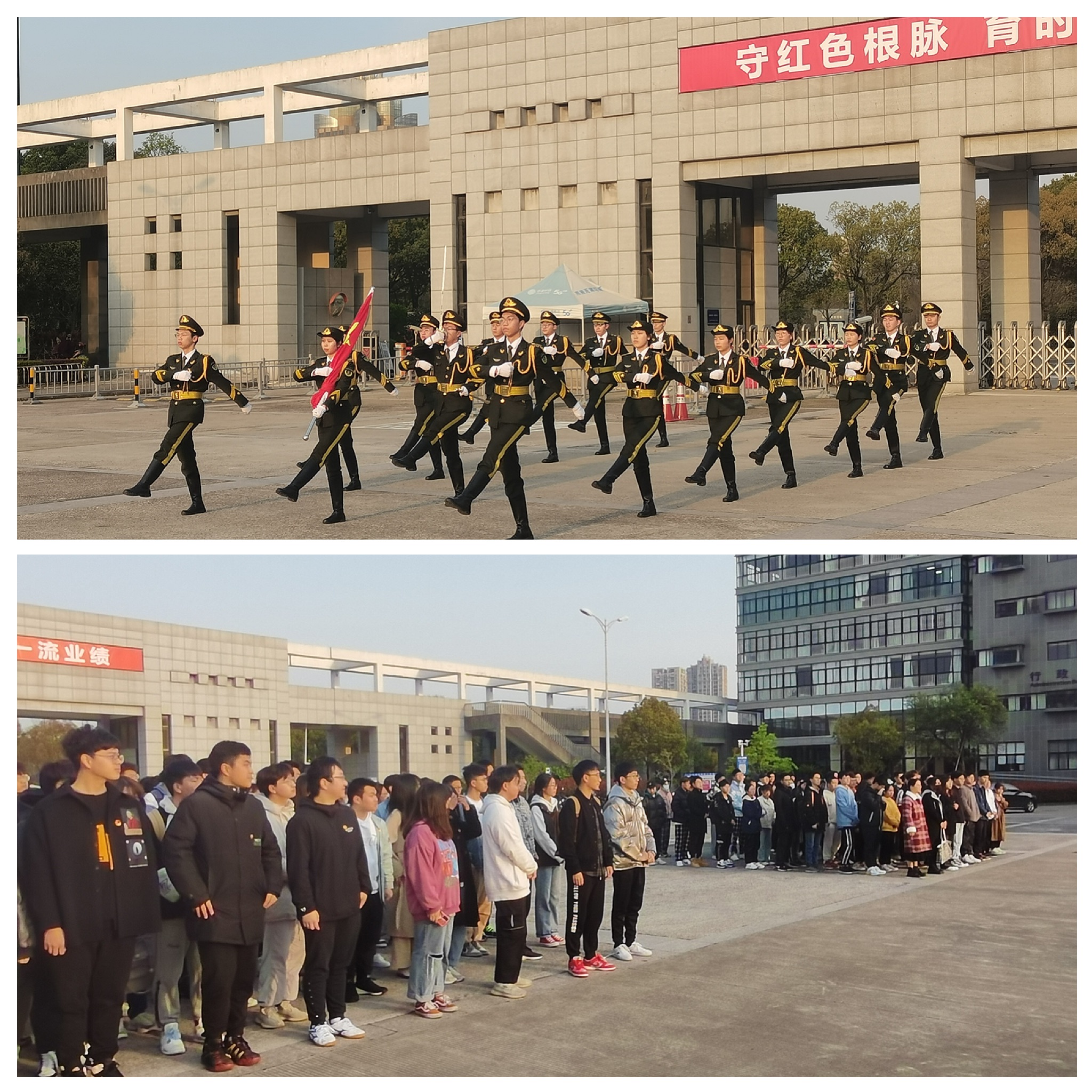 迎着初升的太阳,英姿飒爽的国旗护卫队队员们迈着铿锵有力,整齐划一的步伐护送国旗来到旗杆下。伴随着庄严的国歌,升旗手振臂一挥,所有人肃立,向国旗行注目礼,鲜艳的五星红旗徐徐展开,在晨曦中迎风飘扬在浙大宁理的上空。