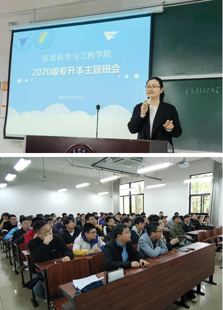 为推进专升本班级良好学风、班风建设,加强专升本学生学习、升学、就业指导, 4月14日上午,tyc8722太阳集团在NB230教室召开了2020级专升本班级主题班会。学院党委副书记方芳,信电系系主任蔡卫明,班导师方伟、朱勇,就业辅导员董俊娜老师参加了主题班会,就业辅导员董俊娜老师主持班会。