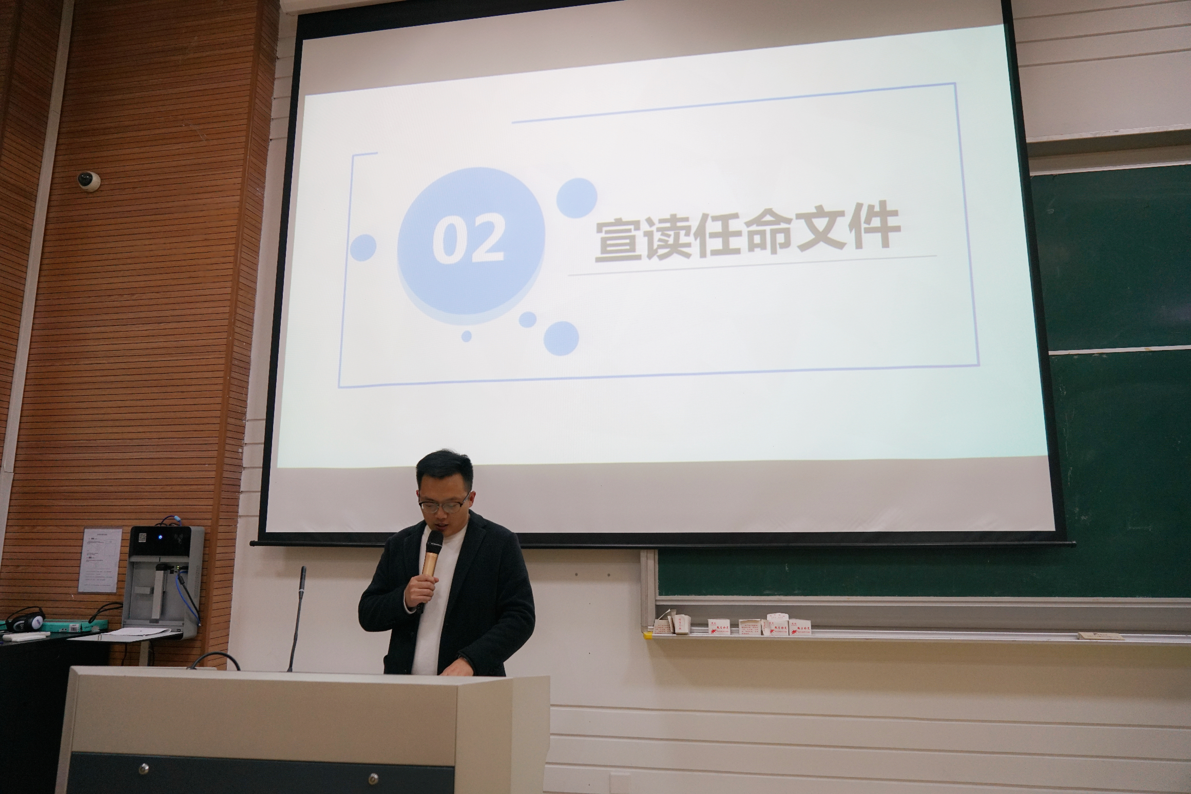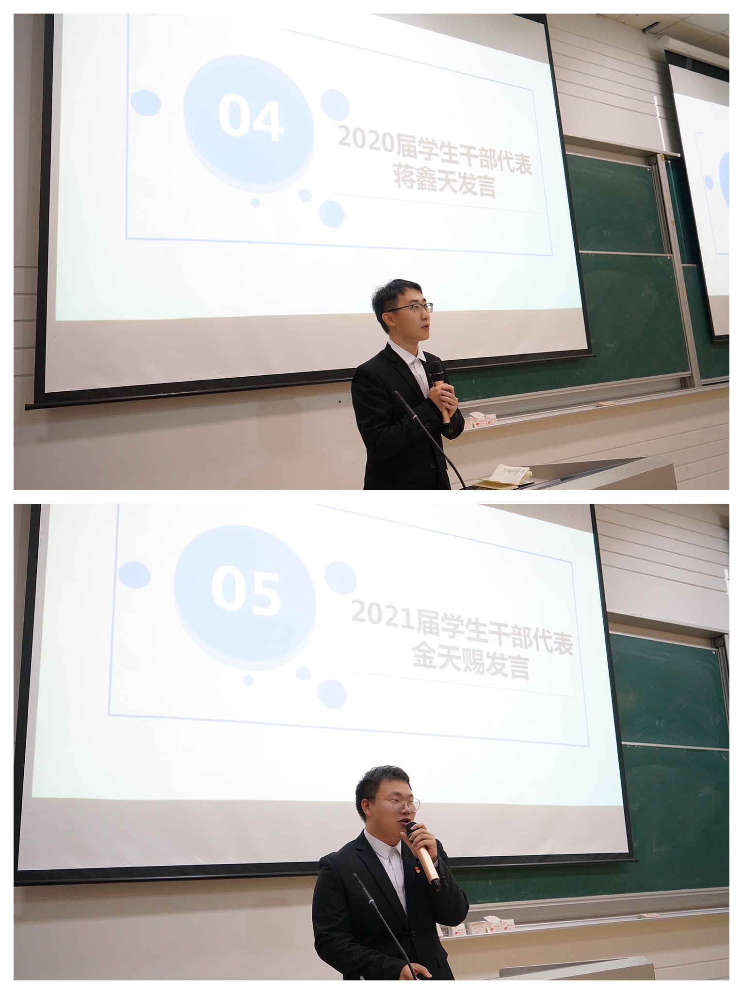 首先,由金智展宣读宣读任命文件。随后,2020届学生干部代表蒋鑫天发言,回顾了他大学任职生涯的成长历程,分享了切身的工作感悟,并希望新主席团成员能够“在其位,谋其政,担其责”,并通过携手合作,把团学越办越好。2021届学生干部代表金天赐则分享了自己刚进入团学的初心与使命,表达了定不负学长、老师、同学们的信任与期望,牢记初心,脚踏实地,带领团学向更高水平迈进。