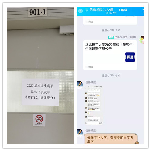 学院建立由专业教师、毕业生组成的考研交流群,群内专业教师及时共享考研复试、调剂信息,为学生答疑解惑,学生之间共享学习信息,形成良好的互助氛围。