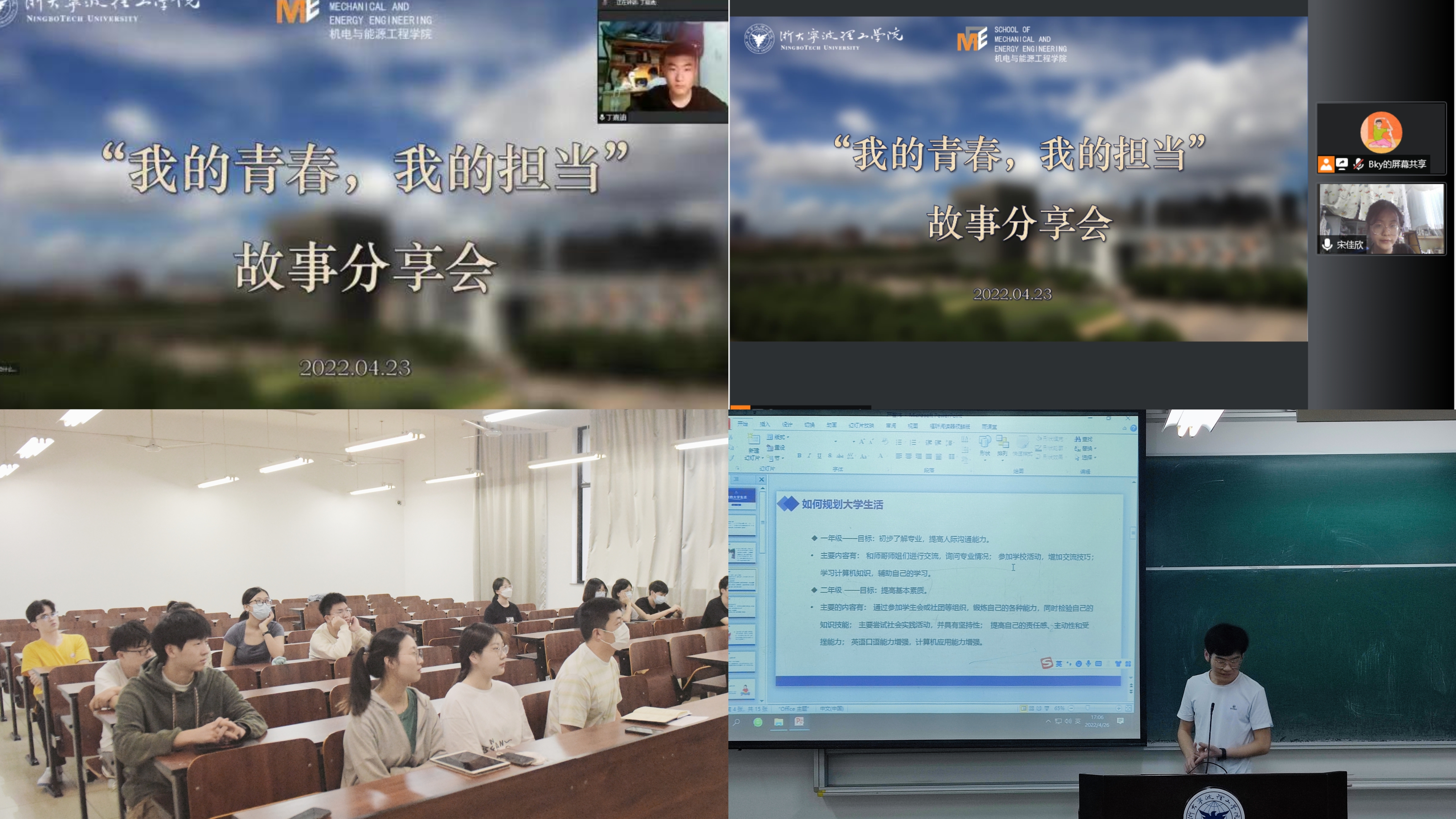 4月23日,机能学院通过线上会议方式,邀请了四位来自不同专业的优秀学生代表:宋佳欣、傅磊、丁嘉迪、张坚源,为大家分享考研经验。宋佳欣同学分享了学科竞赛经历,干货满满,同时呼吁同学们多参与学科竞赛、科研实践等活动。傅磊同学是一名退伍大学生,已被东北电力大学研究生院拟录取,他分享自己两年的部队生活带给自己的成长经验,同时也鼓励大家不管是在学习上还是生活中都要有坚持的意志。来自能源专升本201班的丁嘉迪同学已被北京工业大学研究生院拟录取,他分享了自己的考研经历,给予同学们学习方法的建议。张坚源同学向我们分享了他的太阳集团经历和考研经验。作为主要学生干部,他跟同学们分享了如何把握太阳集团和学习之间的平衡关系,做到学习工作两不误,全面发展。