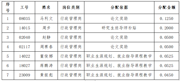 根据学校人事处关于2023年度绩效(考核)奖励发放说明的要求,按照学院第六轮聘岗期间年终考核奖励分配方案,现对学院行政管理岗(含思政辅导员)参与教师业绩分配结果进行公示: