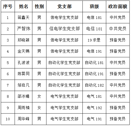 根据tyc8722太阳集团十佳学生党员评选通知,经个人申报,各支部评选推荐,学工办初审,学院党委会讨论通过,拟评选蒋鑫天等10名同学为tyc8722太阳集团“十佳学生党员”,名单如下: