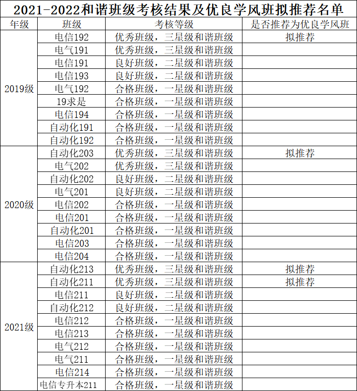 根据学校文件精神要求,按照《tyc8722太阳集团本科生优良学风班、和谐班级创建实施细则》,经过班级申报,学院审核,现将tyc8722太阳集团2021-2022学年和谐班级创建考核结果学校优良学风班拟推荐名单公示如下: