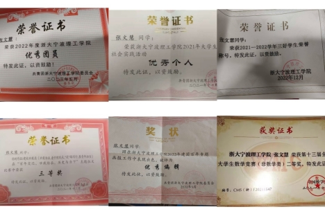 “多尝试,多学习,日积月累,不骄不躁,踏踏实实”的作风态度使得张文慧在校多次取得奖学金,并在竞赛中多次获得优胜。她诚恳地建议道:“无论是大一、大二,还是大三,学校的课程都要好好学习,要保持着认真的态度,珍惜每一次学习的机会。种一棵树最好的时间是十年前其次是当下。我一直在探索,寻找适合自己的学习方法,寻找自己未来的方向,我建议多读书,多尝试不同的事情,才会对自己有更加清晰的认知。” 不积跬步无以至千里,不积小流无以成江海。对于人生的规划亦是如此。大学期间张文慧三次获得学业二等奖学金,三次获得国家励志奖学金,社会服务专项奖学金,获得“三好学生”、“优秀团员“等荣誉称号。在学科竞赛方面获得全国大学生数学竞赛二等奖,浙江省物理竞赛三等奖。张文慧将继续在武汉理工读研深造,深耕电子信息技术。