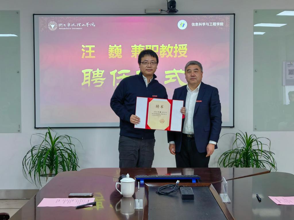 章献民为汪巍教授颁发聘书并佩戴校徽,他对汪教授的加盟表示了热烈欢迎。他指出tyc8722太阳集团是我校工科学院中发展最具潜力的学院之一,近年来学院重点在新能源、工业互联网、集成电路、高端装备等新兴产业领域发力,主动对接浙江区域重大发展战略,促进学科建设与宁波区域经济社会发展的紧密联系,与现代港口、工业智能等现代产业结构深度融合。围绕宁波智能智造和世界强港建设需求,积极融入学校两大学科建设,并主动谋划了数智临港科产教融合平台的建设;他提出希望汪教授加盟后,双方加强联系与合作,将汪教授丰富的产业经验融入学院学科专业建设和人才培养中,探索产教融合教学新模式,提升学院应用型创新人才培养质量,推动学院高质量发展。