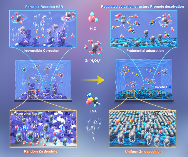 图 1. ESA 改性前(左)和改性后(右)电解质中的锌沉积行为示意图。
