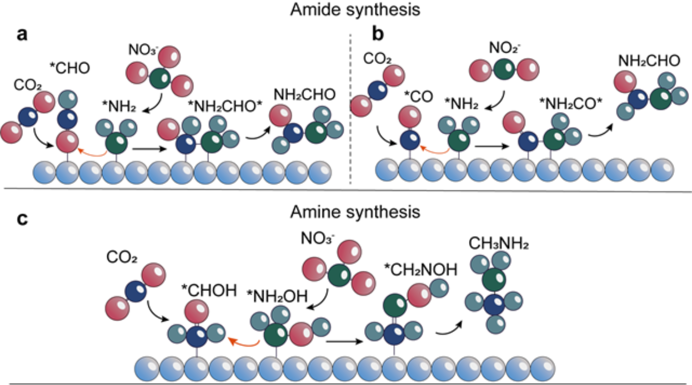 图3. 电催化合成酰胺和胺的C-N偶联机制。