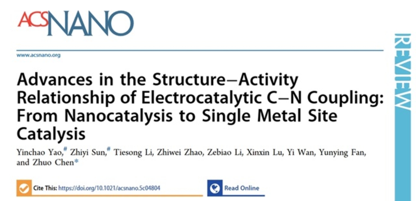 2025年5月,北理工陈卓团队综述了电催化C-N偶联反应从纳米催化到单金属位点催化的最新进展,相关研究成果以“Advances in the structure-activity relationship of electrocatalytic C-N coupling: from nanocatalysis to single metal site catalysis”为题在国际顶级期刊《ACS Nano》上发表,并受邀在官方American Chemical Society微信公众号上发表highlight。陈卓研究员为论文通讯作者,博士生姚尹超和孙志一为共同第一作者。