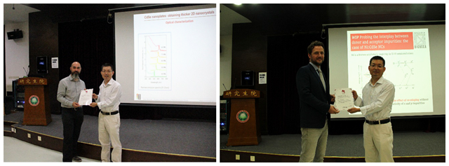 在国家外专局短期引智项目的支持下,受材料学院结构可控先进功能材料与绿色应用北京重点实验室主任张加涛教授、李红博教授邀请,国际半导体纳米晶/量子点研究专家米兰比科卡大学Sergio Brovelli教授和比利时根特大学Iwan Moreels 教授于2019年9月22-28号访问北理工。9月26日上午,在中关村校区研究生楼101报告厅分别做了题为“Colloidal synthesis of fluorescent 2D nanocrystals across the visible and near-infrared range”和“Advances in electronic doping of solution-grown semiconductor nanocrystals towards cutting-edge application”的“百家大讲堂”学术报告。张加涛教授代表北理工向两位教授颁发了北理工“百家大讲堂”纪念证书。材料学院钟海政教授、陈棋教授,上海交通大学李良教授,澳大利亚科庭大学夹国华教授,以及材料学院、化学学院其他青年教师和学生聆听了此次报告。