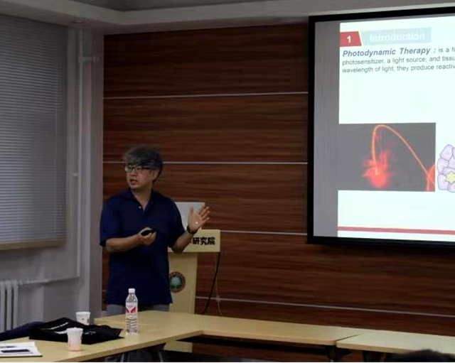 随后,Kim教授详细介绍了他在治疗诊断学上的研究成果,将一些共轭的有机荧光分子与靶向分子和抗癌药物分子相结合,将靶向、治疗与诊断相结合,合成了很多具备肿瘤选择性靶向、毒性降低、副作用小等优点的有机荧光分子;并且应用于细胞和小鼠动物模型中都有不错的效果,具有重要的临床意义。