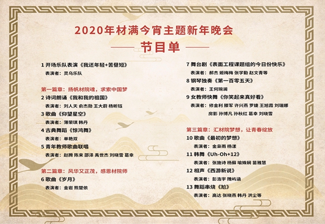 “材满今宵”新年晚会是我院的传统品牌庆祝活动,在每年新年到来之际,师生欢聚,举院同庆,丰富了我院师生的课余生活,展现了我院师生的精神面貌。在2020年北理工即将迎来80周年华诞之际,真诚地祝福北理工材料学院的每一位师生,在新的一年梦想成真,在追梦路上扬帆起航!