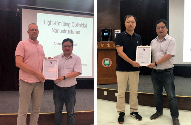2019年8月19日下午13:30,由北京理工大学研究生院主办、北京理工大学材料学院承办的北理工“百家大讲堂”第223期——“纳米发光材料及器件”在北京理工大学研究生院101报告厅举行。讲座邀请香港城市大学Andrey Rogach教授和浙江大学金一政教授为主讲嘉宾,材料学院材料物理与化学系主任钟海政教授主持讲座,材料学院院长庞思平为两位教授颁发了“北理工百家大讲堂”讲座证书。