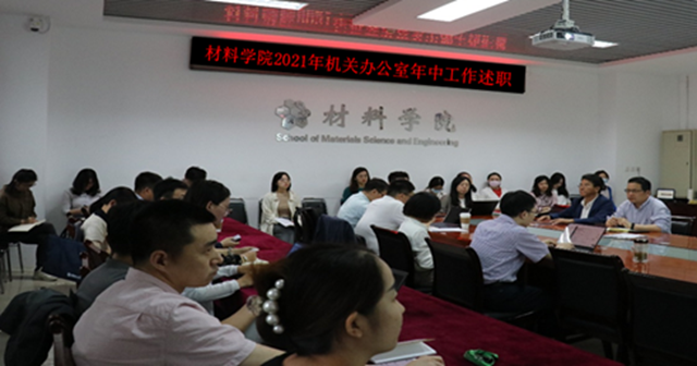 2021年5月31日下午,材料学院机关人员年中工作交流汇报会在学院502-1会议室举行。学院办公室、学生工作办公室的17名老师进行了年中工作汇报,学院党委书记金海波、院长庞思平及其他学院领导班子成员、各系(中心)主任、党支部书记作为考核评委参与此次会议。会议由副院长刘艳主持。 会议开始,庞思平院长指出,学院机关人员定期考核评价是学院综合改革的一项重要举措,是推动学院治理能力提...
