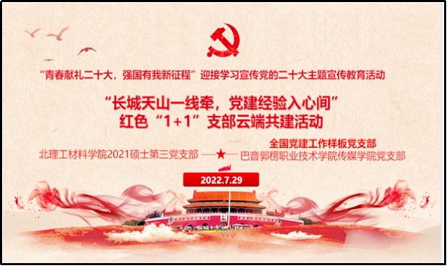 为庆祝建党101周年,喜迎党的二十大胜利召开,进一步强化党建引领,促进校际党建合作交流。2022年7月29日上午,北理工材料学院联合新疆巴音郭楞职业技术学院开展“长城天山一线牵,党建经验入心间”红色“1+1”支部云端共建活动。北理工材料学院党委书记、院长金海波,巴音郭楞职业技术学院党委委员、副院长王红,巴音郭楞职业技术学院传媒学院党支部书记孟轩羽全程参加指导共建。北理工材料学院2021级硕...